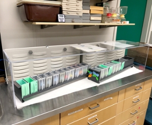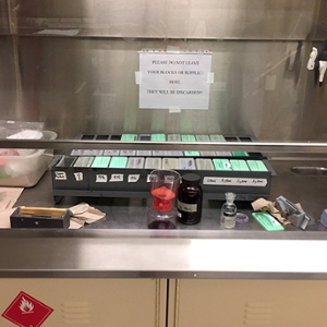 The slide coverslipping workstation is available on a cost-recovery basis. Mounting fluid and coverslips (regular sizes) are provided at no additional cost — this is included in the stain workstation fees.
